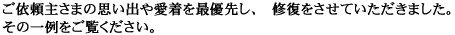 最近に新築された家に古くからある思い出深い道具が使われず仕舞い込まれていることに気づかれ、それらをお直しになられることになった偶然の出会いでの復活品たち。 |