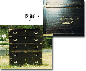 虫喰ったり割れたりと痛みは激しい状態でしたが、修復してローチェストに。塗りは布目の溜塗りで仕上ることになりました。